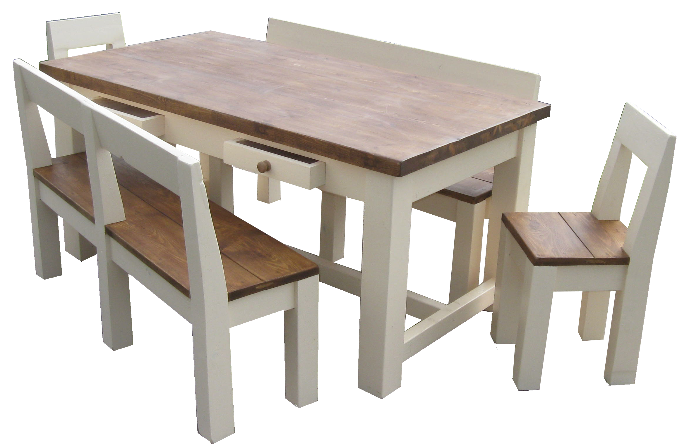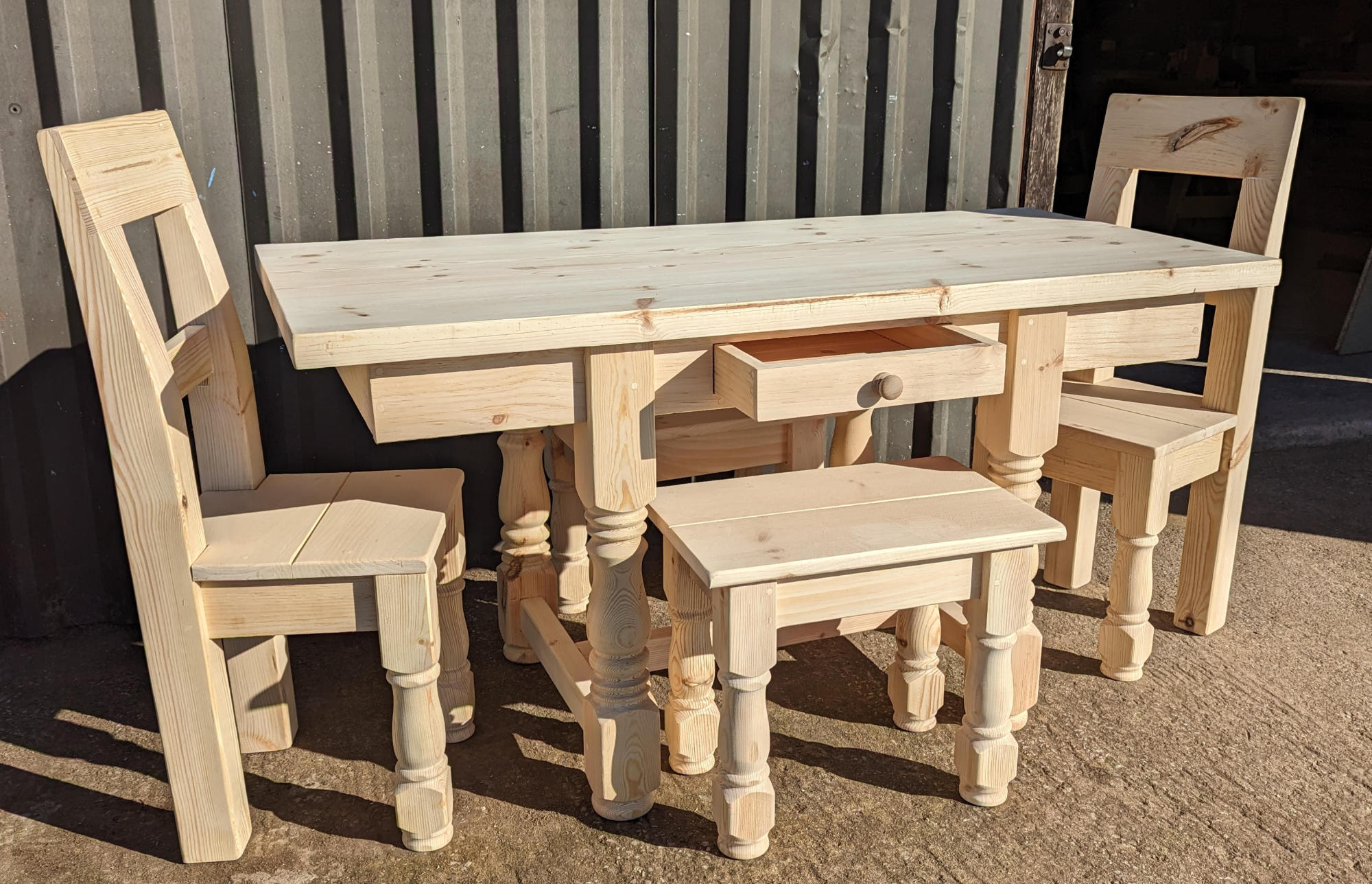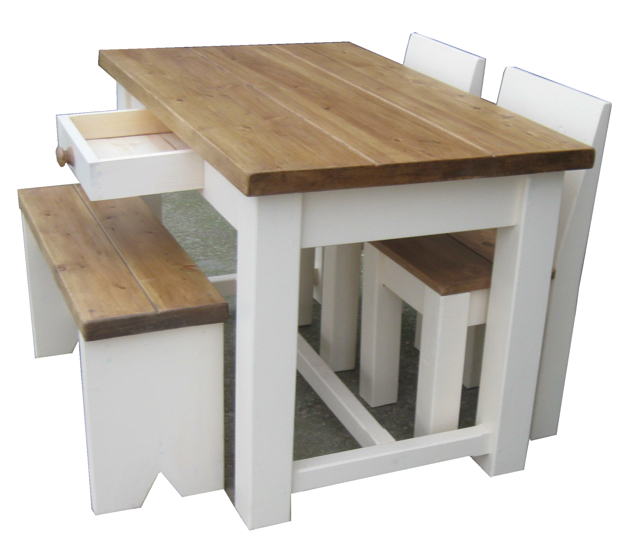 It has one two seater bench and 2 chairs. The table has one drawer. The colour is a Rich Brown Bri Wax and Farmhouse Cream or can be any Farrow and Ball colour of your choice.